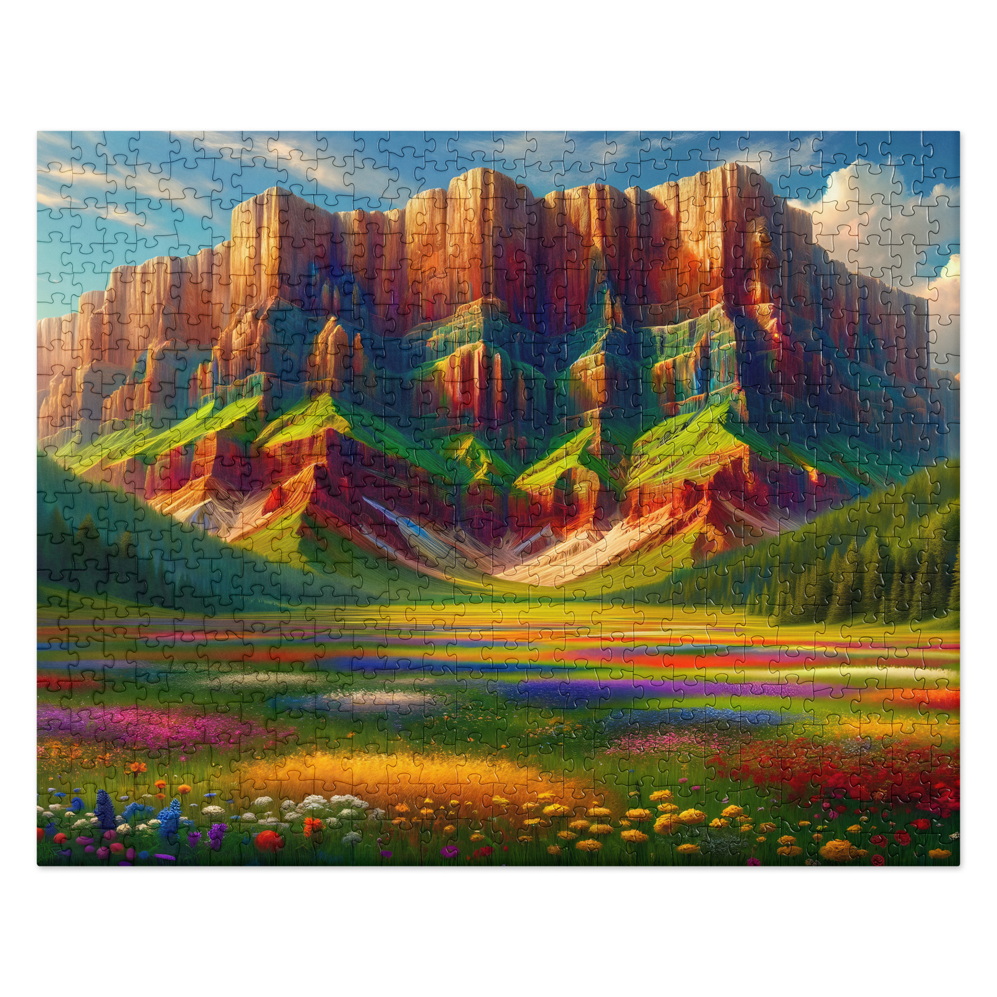 “Embark on a journey to the edge of wonder with our captivating jigsaw puzzle, ‘Cliffside Meadow: Nature’s Edge.’ Immerse yourself in the breathtaking beauty of this majestic scene where rugged cliffs meet the gentle expanse of a verdant meadow. Towering rock formations stand as sentinels to the horizon, their weathered faces adorned with splashes of vibrant flora clinging to their sides. Below, a lush meadow stretches out, a patchwork of greens and golds swaying in the soft breeze. Against the backdrop of endless sky and distant horizons, this serene landscape invites you to pause and savor the tranquility of nature’s embrace. With each piece you connect, you’ll feel the thrill of discovery and the peaceful resonance of being at one with the land. Whether you’re a seasoned puzzler or an admirer of natural beauty, ‘Cliffside Meadow: Nature’s Edge’ promises to transport you to a realm where the wonders of the earth are yours to explore.”