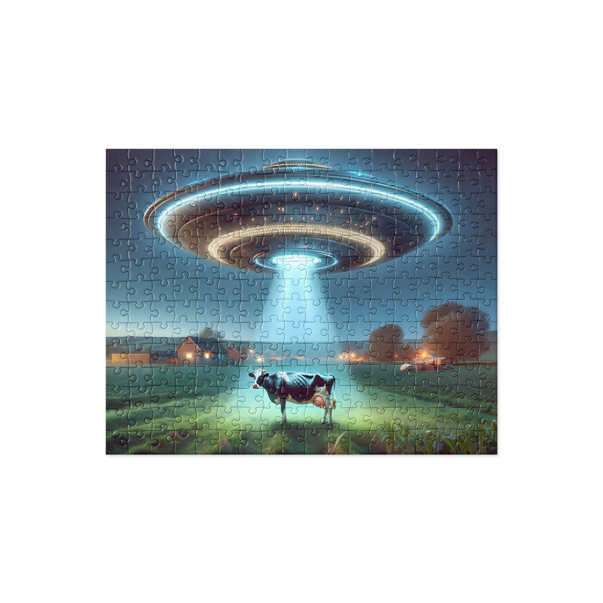 Assemble the puzzle to reveal the hilariously unexpected scene where a wide-eyed cow, sporting an expression of bewilderment, finds itself at the center of a cosmic caper. The detailed illustration captures the essence of the peculiar moment when the UFO’s tractor beam playfully lifts the unsuspecting bovine into the star-studded abyss.