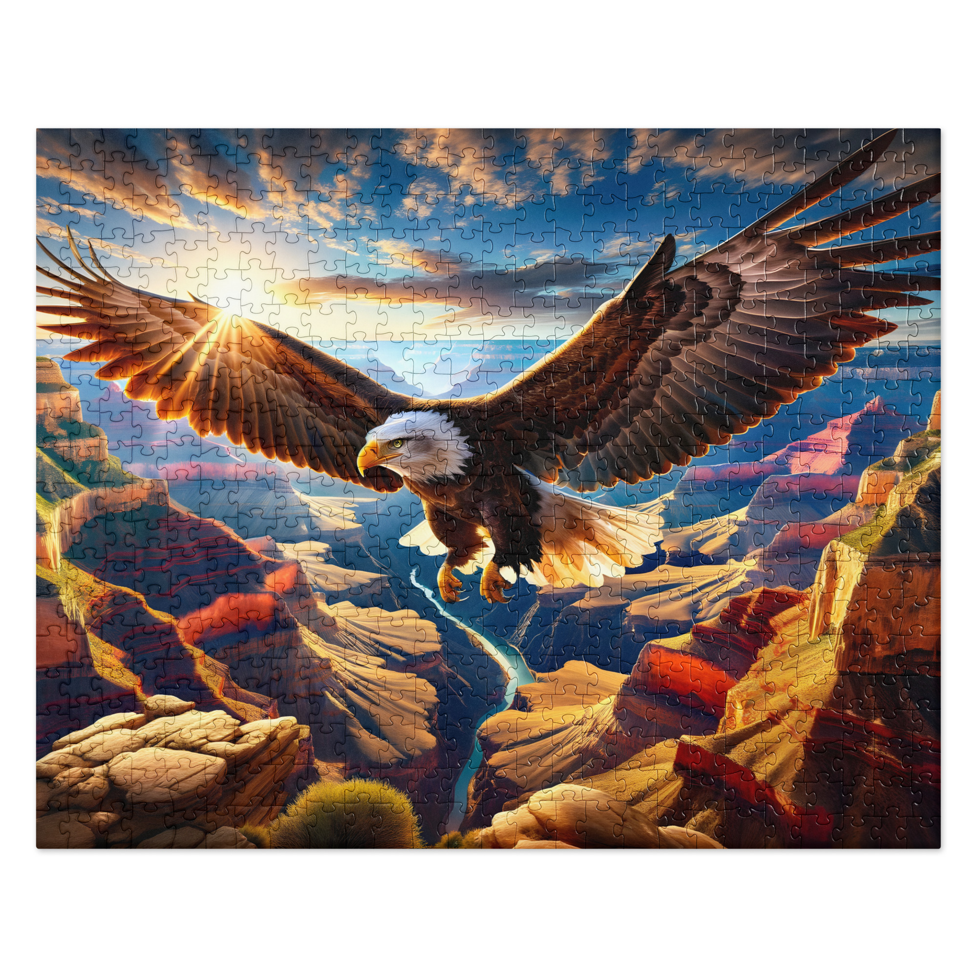 Dive into the splendor of the natural world with our “Eagle’s Majesty Over the Grand Canyon” puzzle. This captivating scene captures a moment of serene beauty as an eagle soars with grace above the Grand Canyon. Witness the detailed feathers of the majestic eagle highlighted by sunlight against the vibrant backdrop of the canyon’s deep gorges, towering cliffs, and the meandering Colorado River below. The rich, saturated colors of the canyon walls, in hues of red, orange, and yellow, contrast strikingly against the clear blue sky, embodying the essence of freedom and the grandeur of the natural landscape. This puzzle invites you to piece together a snapshot of the iconic grandeur of the Grand Canyon, complemented by the awe-inspiring presence of its soaring eagle, offering a glimpse into the wonders of the natural world.