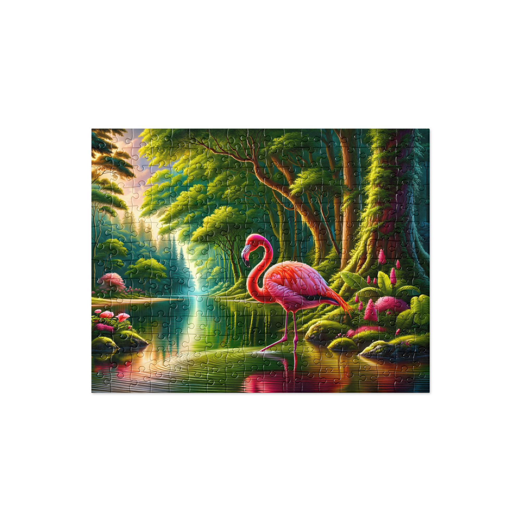 Embark on a tranquil journey with this picturesque jigsaw puzzle capturing the serene beauty of nature. Dive into a scene where a vibrant flamango gracefully wades through the calm waters of a winding river. Lush green trees line the riverbanks, their branches stretching over the water, as the sun casts a warm glow upon the tranquil setting. Each puzzle piece unveils a mesmerizing detail, from the intricate plumage of the flamango to the delicate reflections dancing on the water’s surface. Let the peaceful ambiance of this scene wash over you as you piece together this captivating puzzle, bringing to life the serene charm of nature’s harmony.