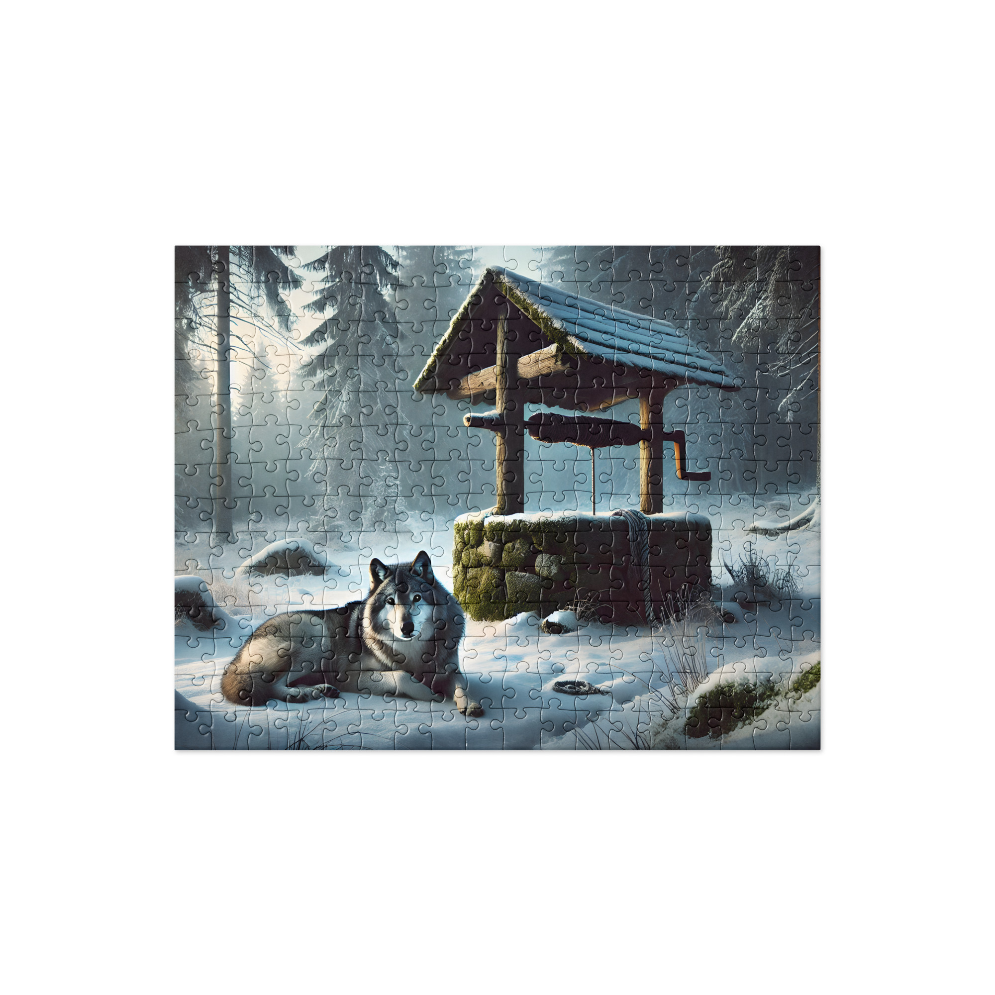 Introducing “Guardian of the Well,” a captivating jigsaw puzzle that invites you into a frosty, mystical forest scene. This beautifully detailed puzzle features a lone wolf lying beside an old, snow-covered well, set against a backdrop of towering pines shrouded in morning mist.