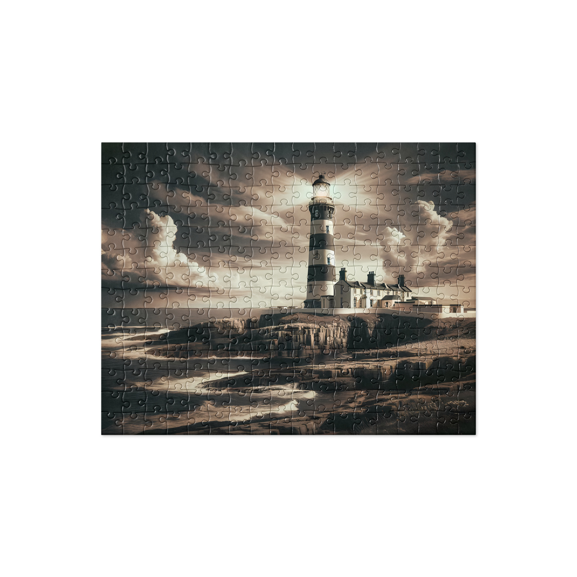 The puzzle invites you to experience the mesmerizing scene of the lighthouse proudly perched on the rocky shore, casting its radiant beam across the turbulent waters. The interplay of light and shadow brings the dramatic seascape to life, capturing the essence of a stormy yet awe-inspiring moment. Each puzzle piece reveals intricate details, from the foamy waves breaking against the rocks to the weathered facade of the lighthouse standing tall against the elements.