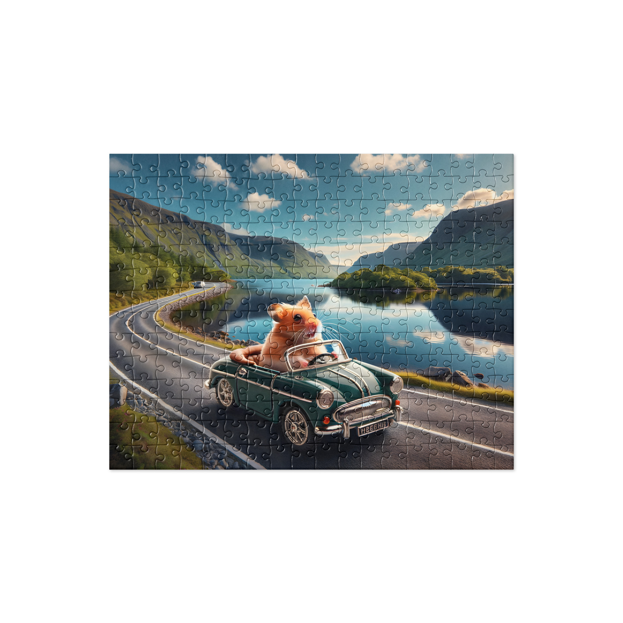 “Get ready to embark on a charming journey with our delightful jigsaw puzzle featuring an adorable hamster cruising in its tiny car along a scenic lakeside road. With intricately crafted pieces, this puzzle invites you to immerse yourself in a world of tranquil beauty and whimsical adventure.