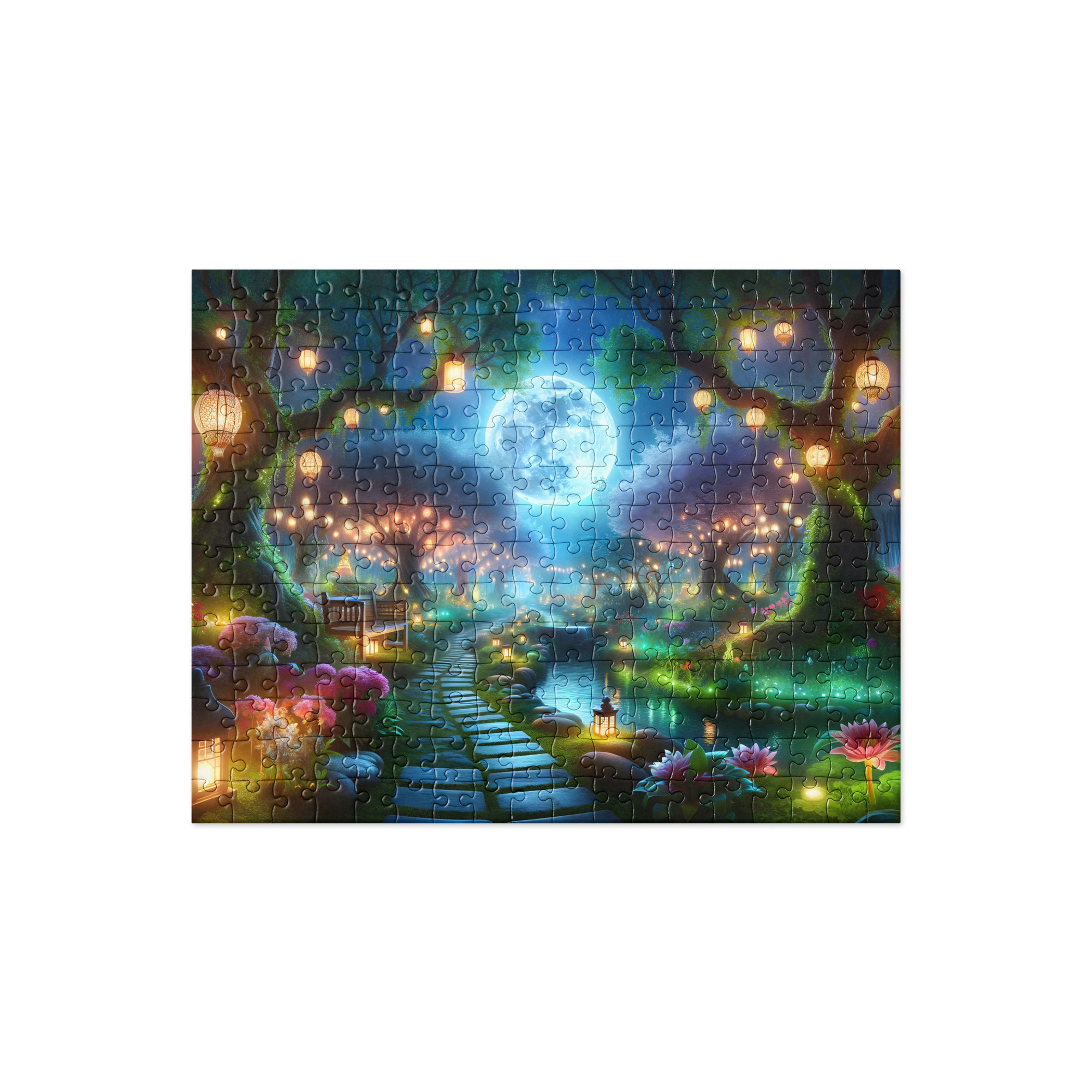 Every piece of this puzzle captures the intricate details of the moonlit landscape, from the delicate petals of blooming flowers to the softly illuminated trees casting graceful shadows. The moon hangs serenely in the sky, casting a silvery sheen over the garden and infusing it with an ethereal radiance.