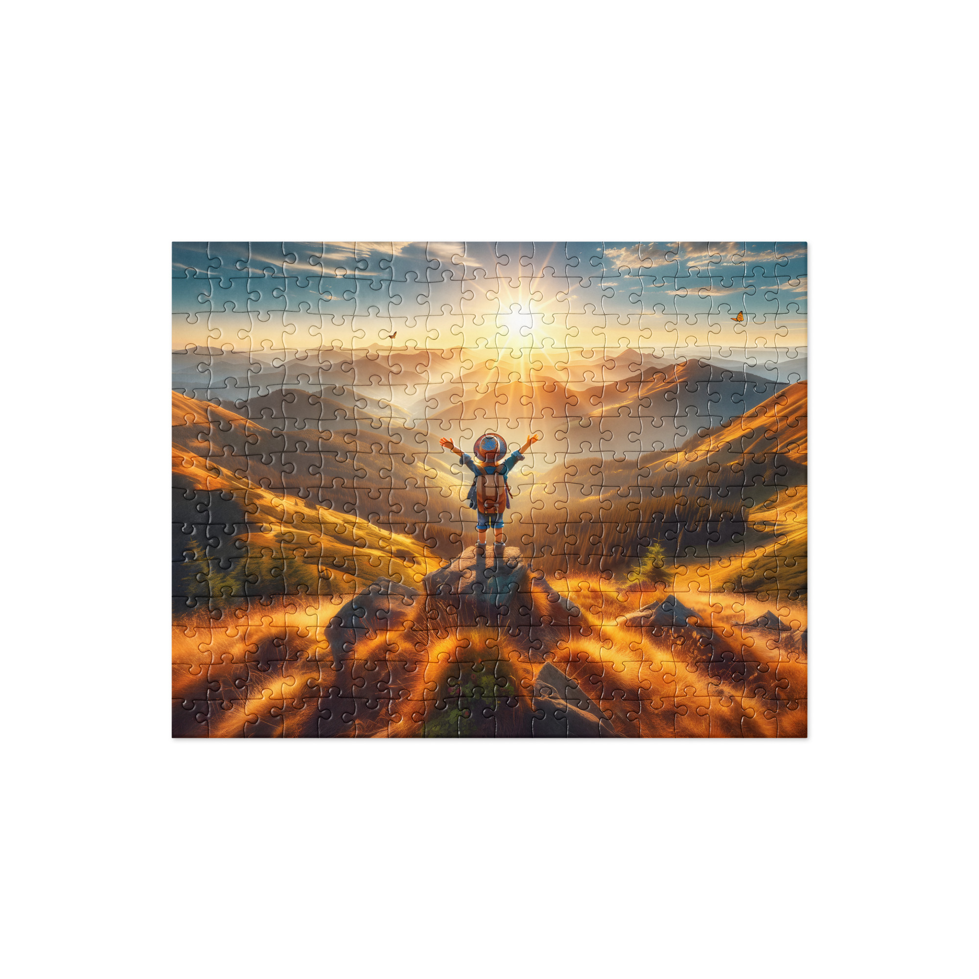 Embark on an exhilarating adventure to the summit of triumph with “Mountain Top Joy” jigsaw puzzle. This captivating puzzle captures the essence of achievement as a young adventurer stands proudly atop a majestic mountain peak, surrounded by breathtaking vistas.