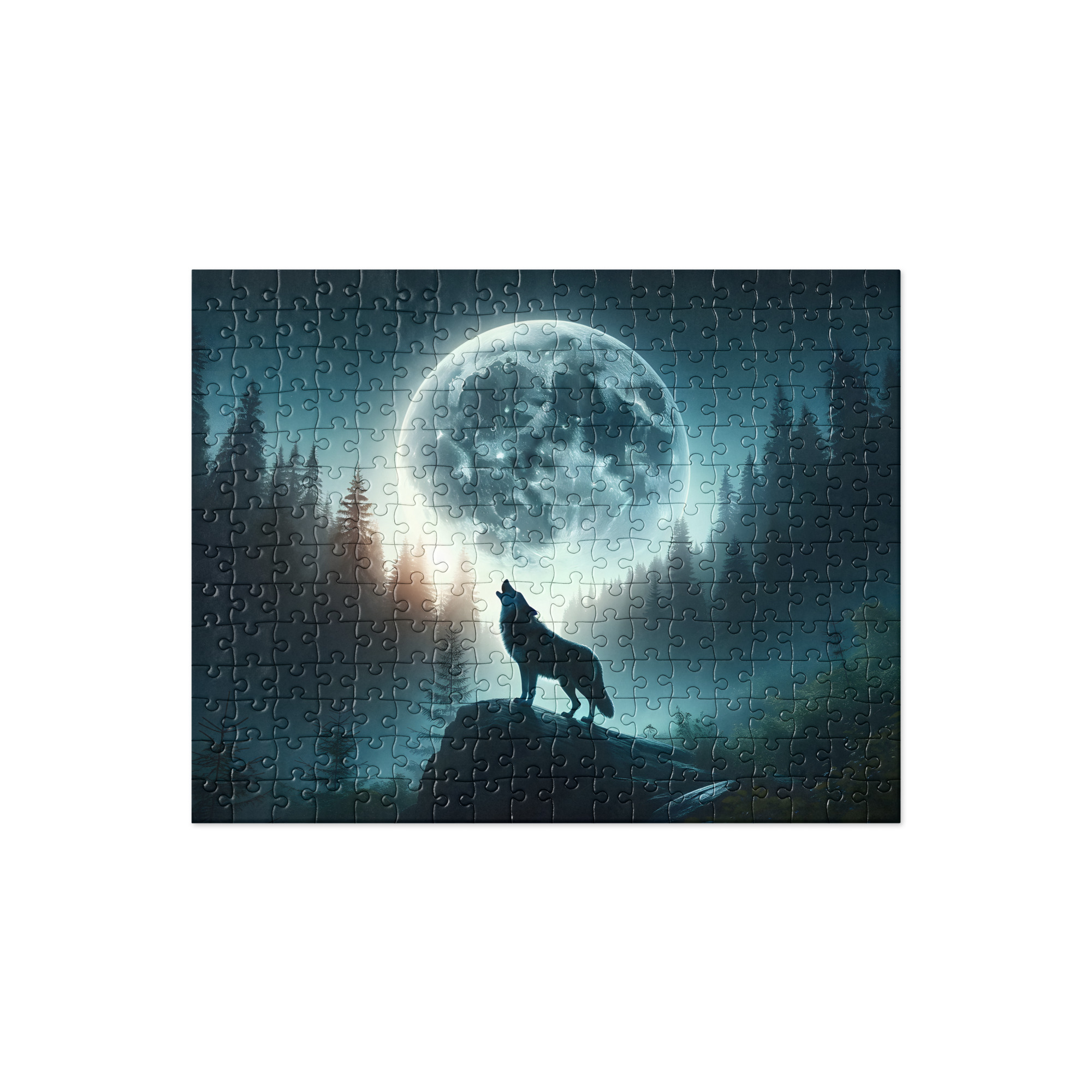 Every piece of this puzzle is meticulously crafted to capture the intricate details of the majestic wolf, from the intensity in its eyes to the texture of its fur. The moon, casting its soft light upon the scene, adds an element of mystery and wonder, inviting you to lose yourself in the magic of the night.